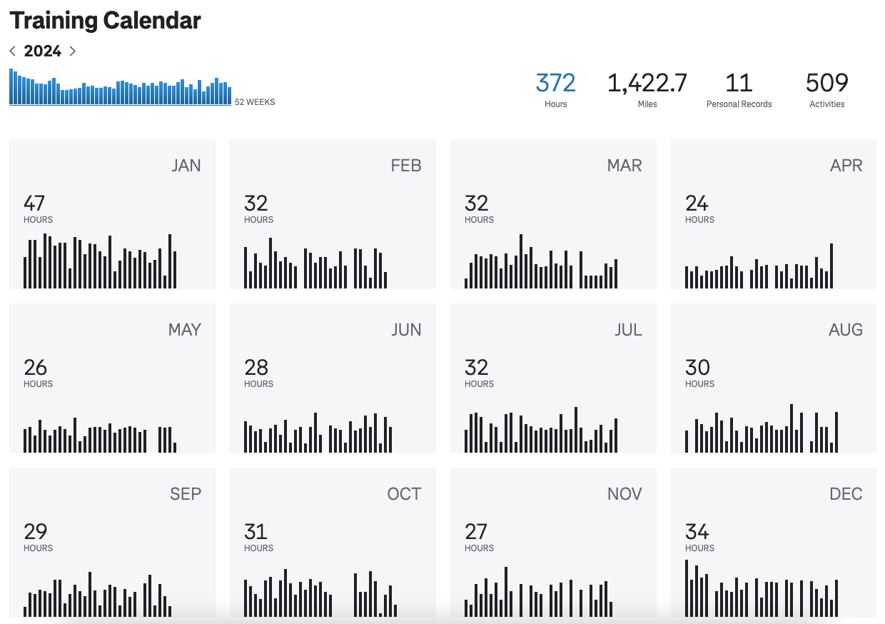 My 2024 was staggeringly consistent, the summer months were unbearable but I did it. It gets well over 100 here and you basically have to wake up and finish your run before the sun rises otherwise it becomes unpleasantly hot especially with the doggos