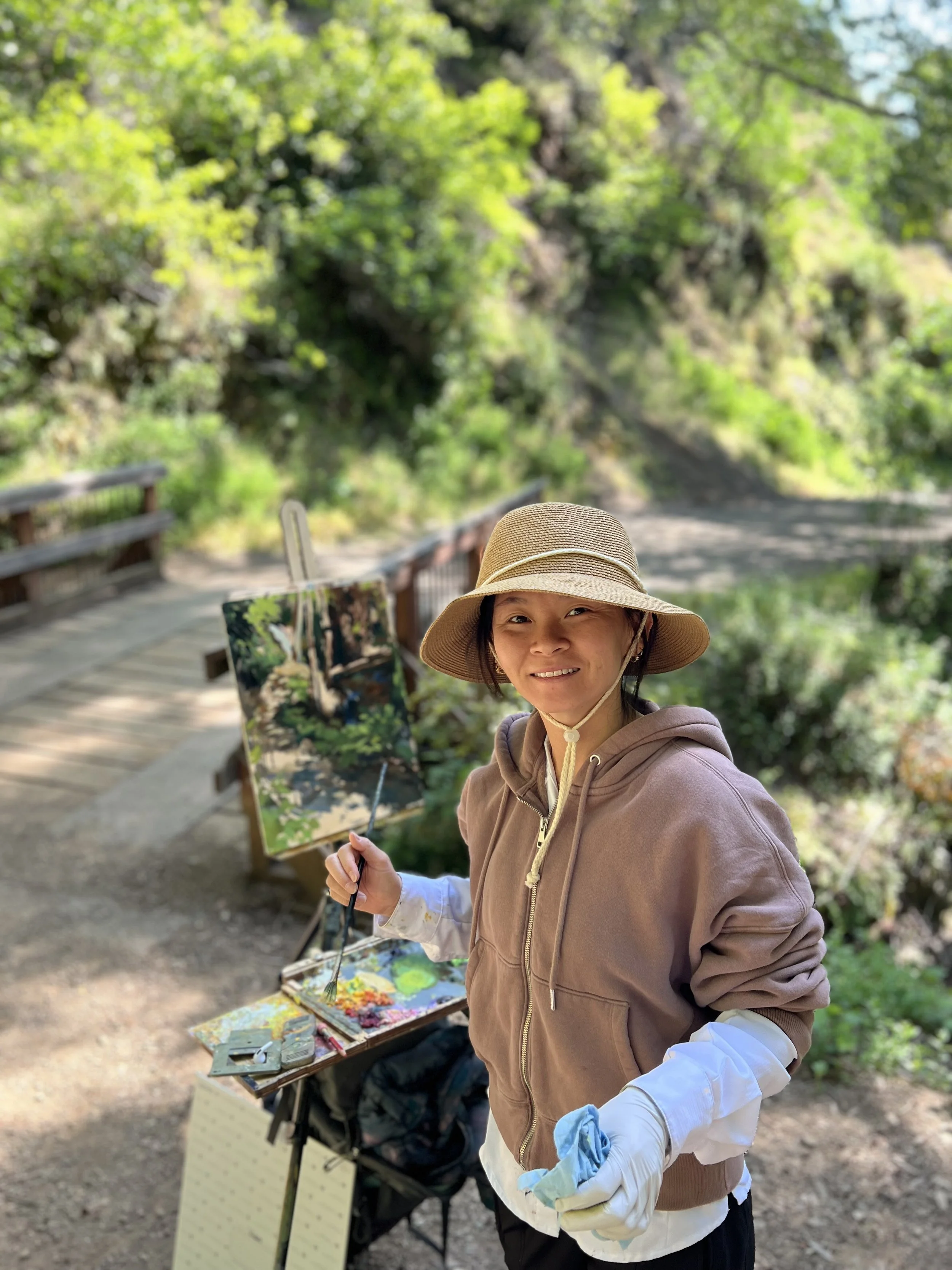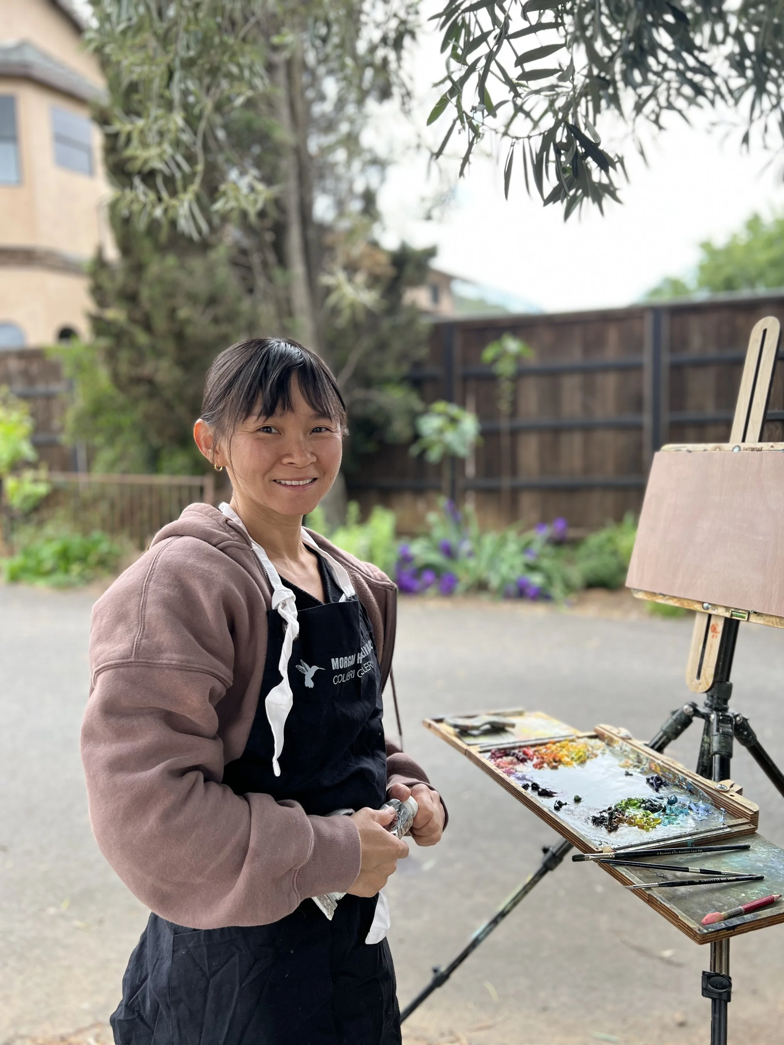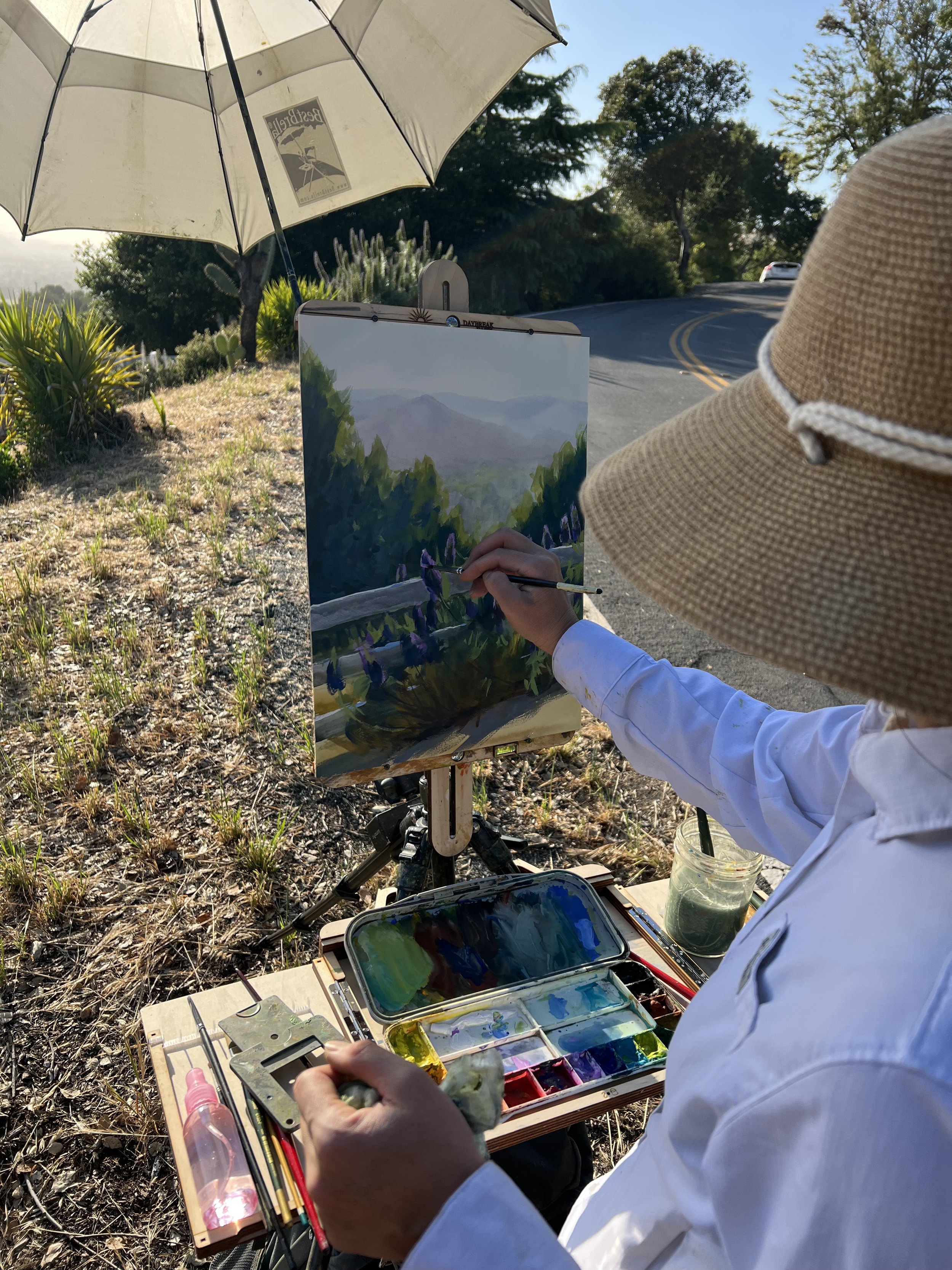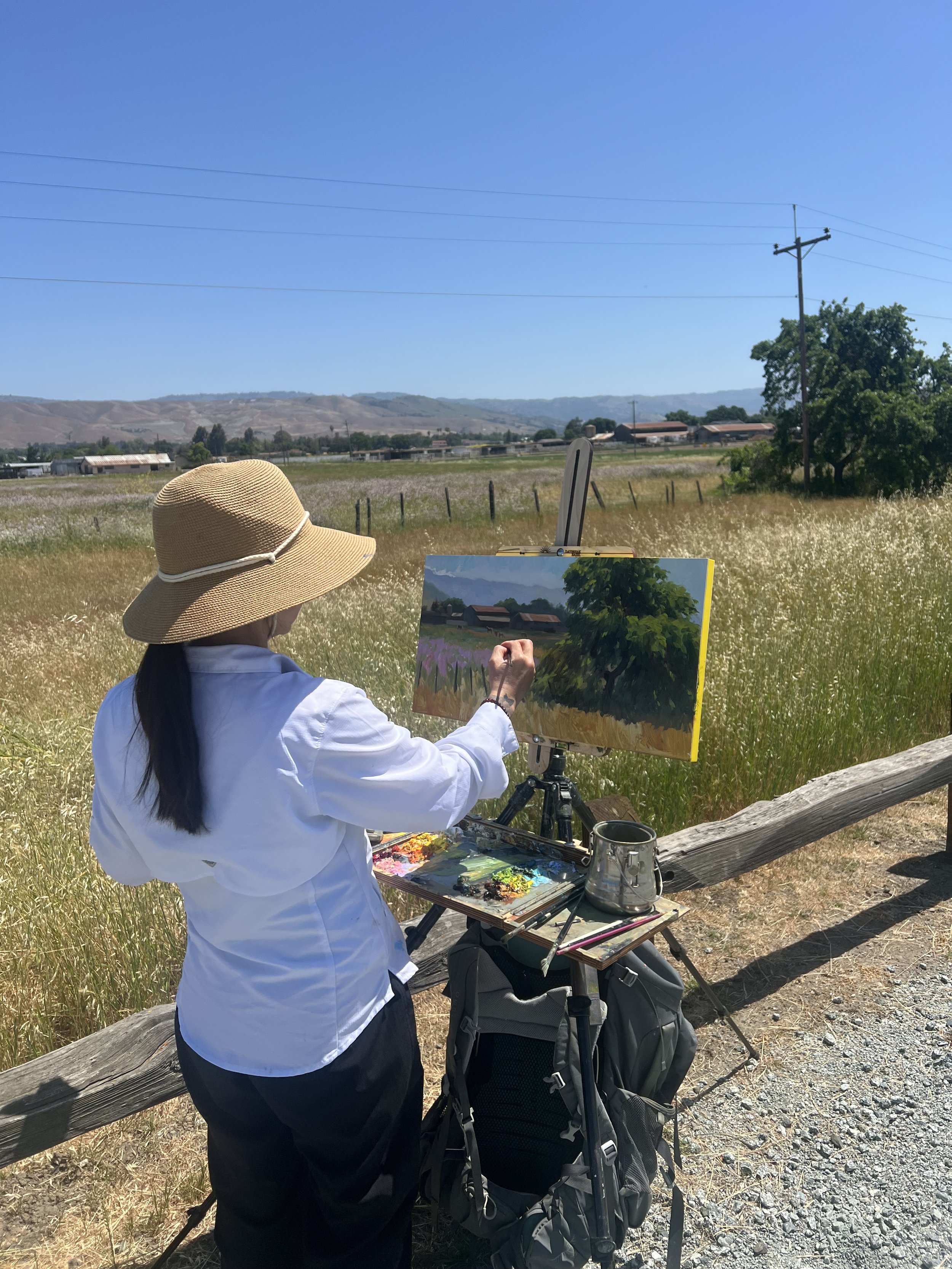 So, after all that she is still at it and just wrapped up a competition in Morgan Hill which is an invite only event so everyone is hand picked to compete. She and 14 other artists participated in a plein air painting event. That means they go outside—yes, with all their gear—and paint what they see: landscapes, buildings, animals, whatever captures their interest. They do this for about three days straight. The only rules: paint in open air, stay within 20 miles of the gallery, and submit no more than six paintings. These works are then judged in a gallery show, with awards handed out and the pieces displayed for sale for the next month.