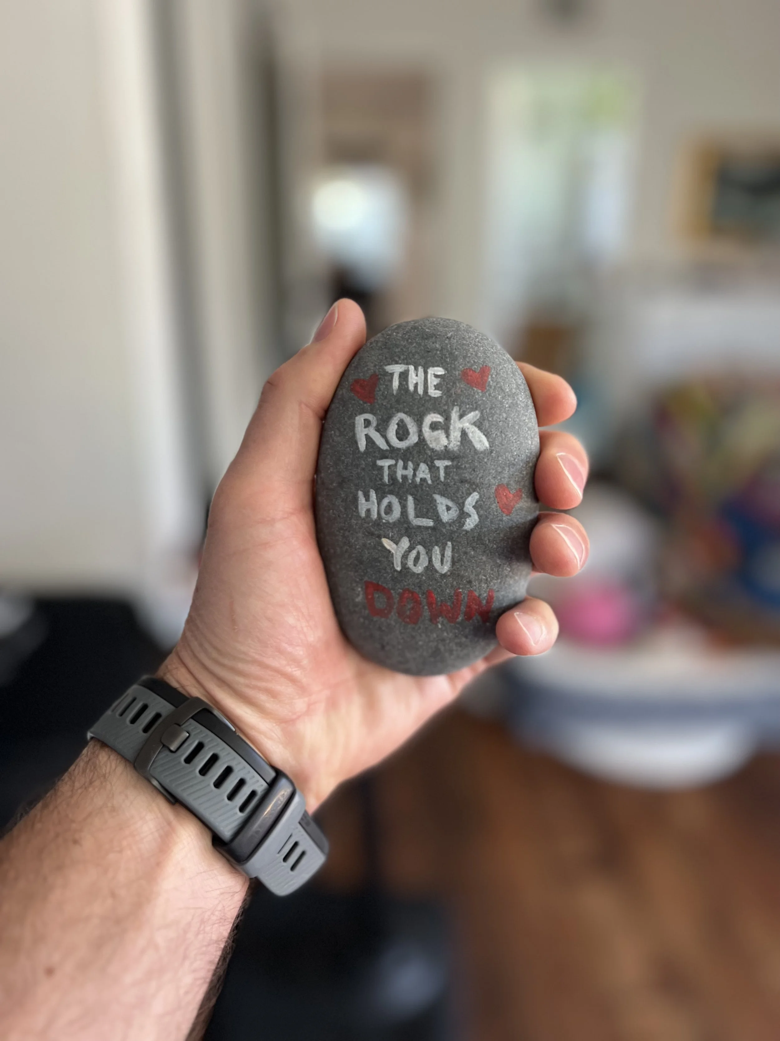 My wife made this for me ages ago because I mentioned that she was my rock that held me down and she thought it was funny because it could be interpreted as something that was holding me back when what I ment was she kept me from flying away. She of course made a comic about it and this rock