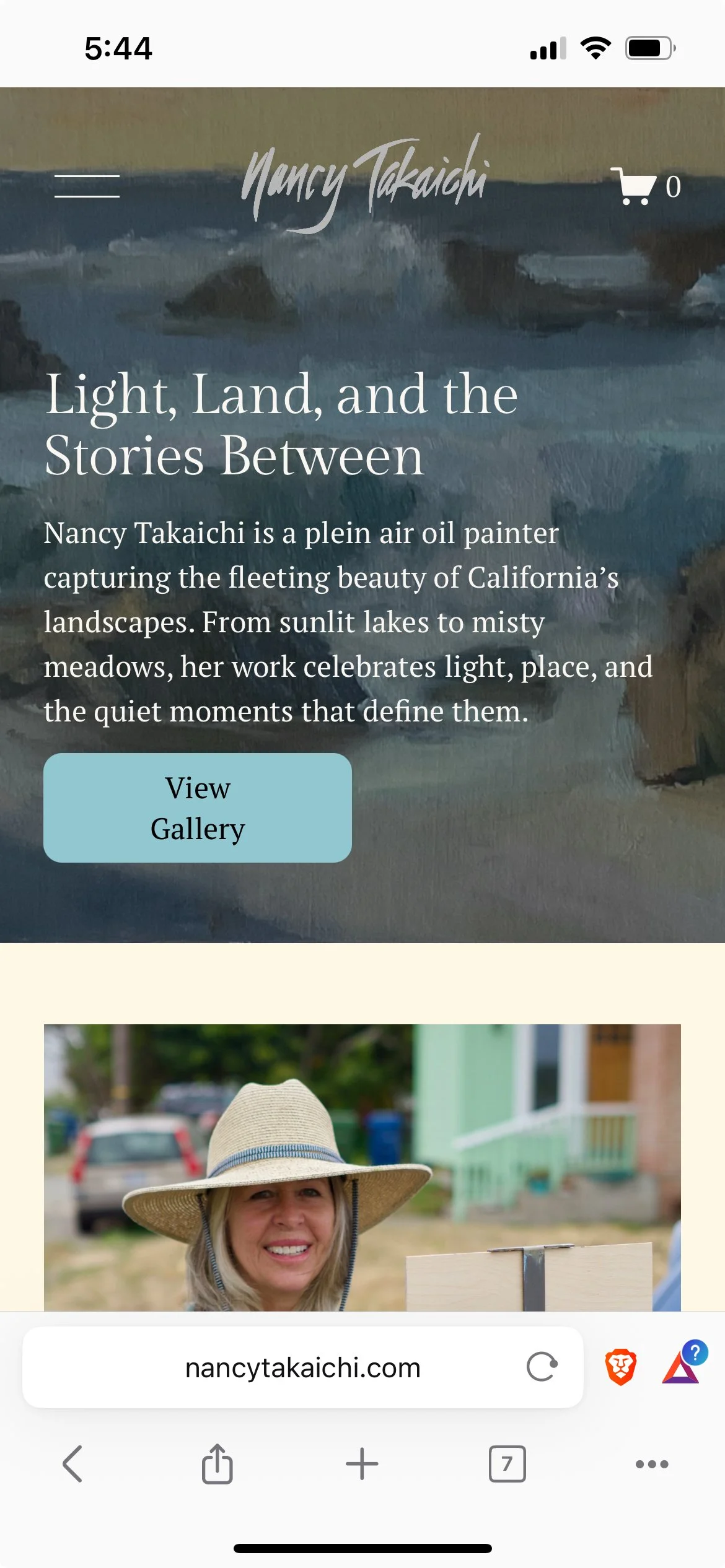 Nancy is a plein air painter whose work captures California's landscapes with sensitivity and natural light. Her online presence needed to reflect her deep compositional practice one that values light, pattern, and place and showcase her gallery-ready work across themes like Coastal, Sierras, Floral, Urban, Country, and Still Life. The challenge: build a brand and website that felt as thoughtful as Nancy’s painting process, while making collections discoverable and approachable for collectors and gallery visitors alike.